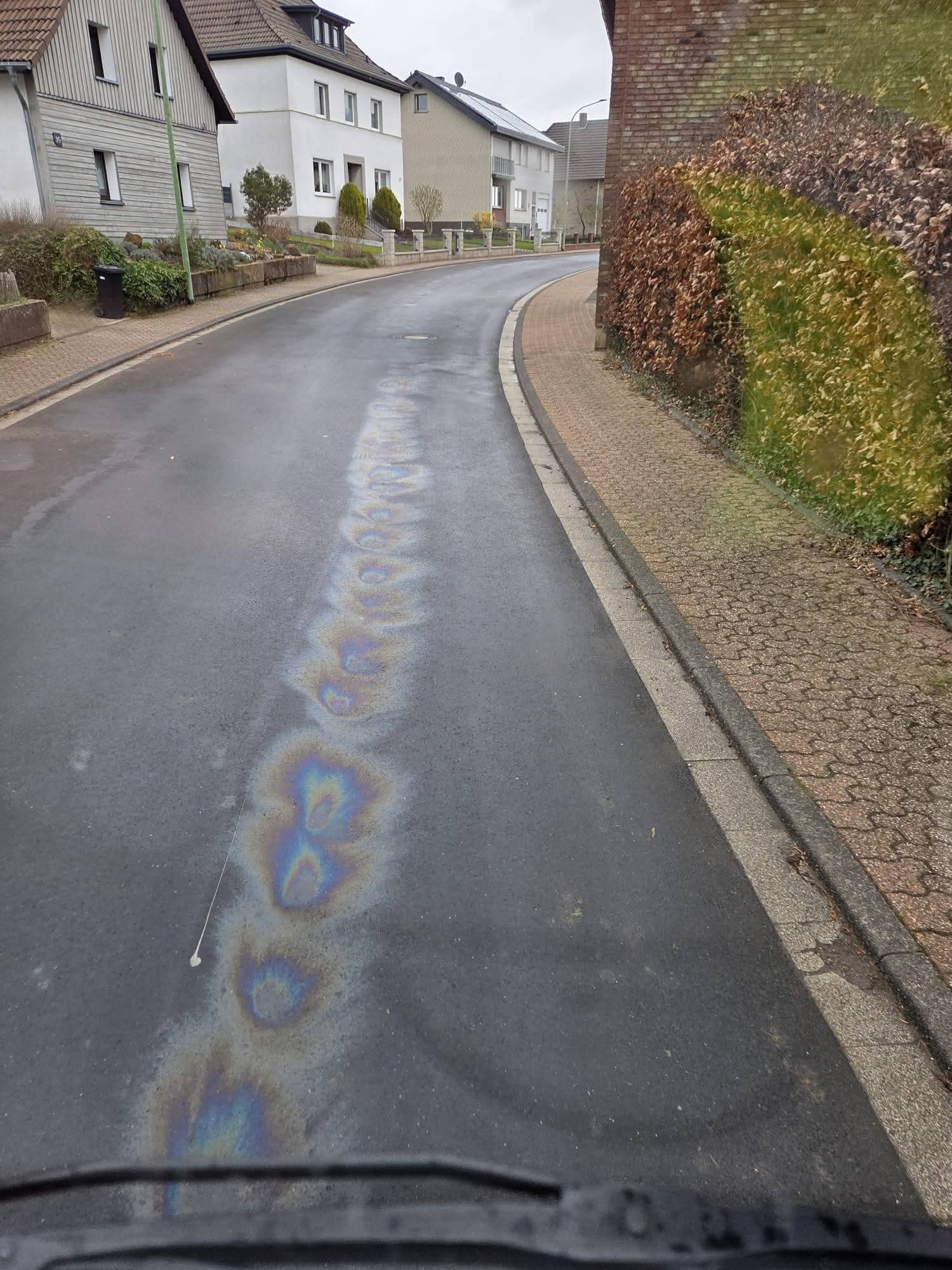 Eine Ölspur zog sich über die Burgstraße in Bergstein über die L-11 in Richtung Kleinhau.