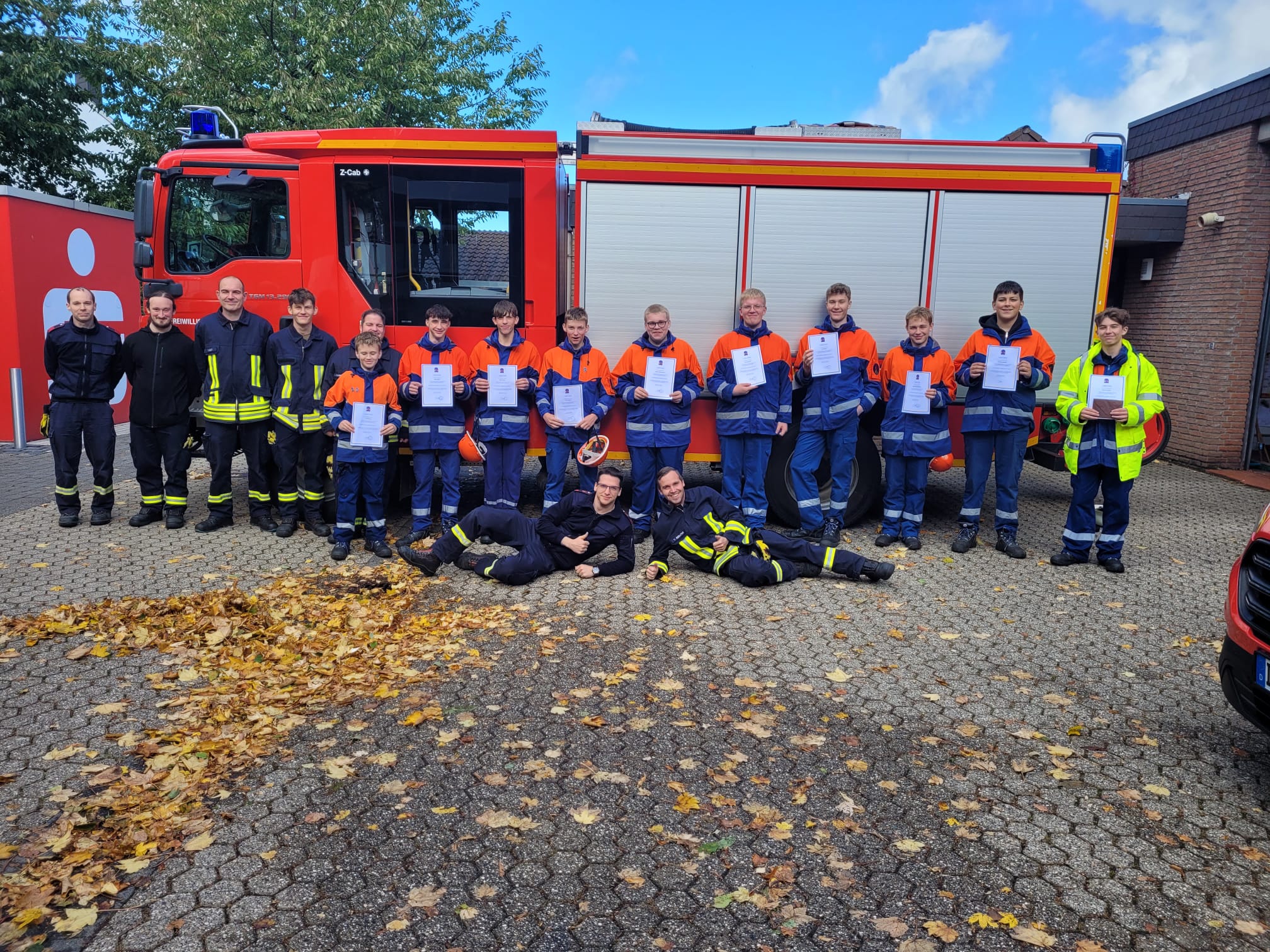 Am 04.10.2025 fand die Abnahme der Jugendflamme Stufe 2 in Düren-Merken statt. 50 Jugendliche aus dem Kreis Düren haben hieran teilgenommen. Von der Jugendfeuerwehr Hürtgenwald nahmen 10 Jugendliche erfolgreich teil. Abgefragt wurde Feuerwehrwissen in Theorie und Praxis. Bei einem Staffellauf mit einer Kübelspritze stand dann die Schnelligkeit und Teamleistung der Teilnehmenden im Fokus. Herzlichen Glückwunsch zu dieser tollen Leistung. Ebenfalls ein herzliches Dankeschön an die beteiligten Jugendbetreuer, die die Jugendlichen wieder sehr gut auf die Jugendflamme vorbereitet haben, sowie die Kreisjugendfeuerwehr und die "Ausrichter-Feuerwehr" der Stadt Düren.